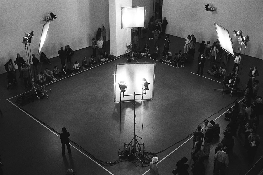 I shot this photo from the floor above the atrium, down onto the piece. I had taken a number of frames from various levels. Most showed the artist and her wordless interlocutor. As I looked through the contact sheet, I realized that this captured best the sense of the work. The artist is present, even if she is seemingly absent from the frame.